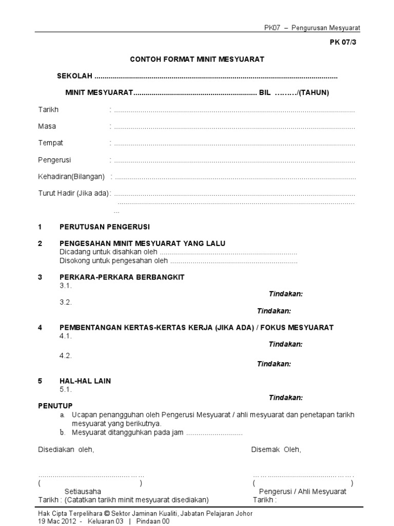 FORMAT MINIT MESYUARAT.docx from imgv2-1-f.scribdassets.com Contoh minit bagi edisi terdahulu pembinaan minit mesyuarat biasanya tidaklah. Text of format minit mesyuarat spsk. Contoh format minit mesyuarat bil perkara tindakan perlu tanggungjawab status diambil semasa. Templat minit mesyuarat ini dibuat dalam dropbox paper, satu ruang kerja kolaboratif yang membolehkan pasukan mencipta dan berkongsi idea awal. Sangat bagus untuk dijadikan contoh. Format minit mesyuarat yang betul pendidik2u sekolah minit mesyuarat kedua bi 2018 english panel meeting 3 2018 docx sjk t ladang regent 73200 gemencheh negeri sembilan darul khusus tel 06 4316643. Selain itu, bermula tahun 2018, pengurusan dan pentadbiran sekolah pada tahun 2017 akan dinilai berdasarkan skpmg2. Format & contoh … перевести эту страницу.